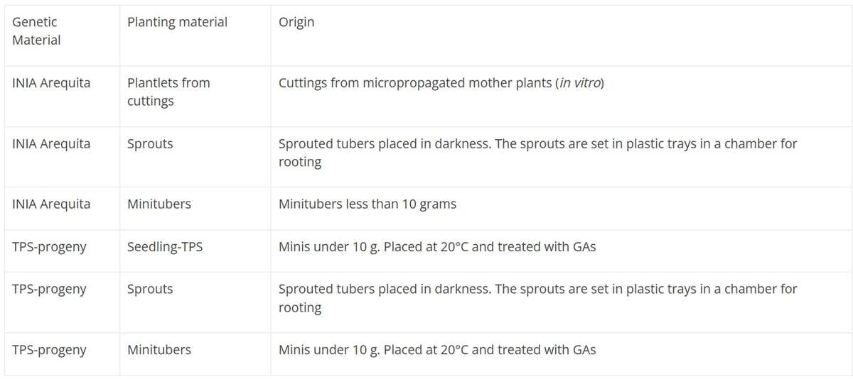 - Evaluate the production potential of seed tubers from two genetic materials and different planting materials (table 1)