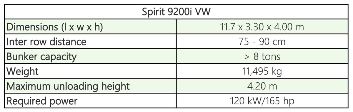 The Spirit 9200i VW is equipped with an 8.5-ton bunker. The unloading height can be adjusted up to 4.20 m, for which a hydraulic collapsible shock absorber or crate-filling funnel is available.